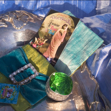 The sumptuous solid perfume comes in a limited-edition custom-designed aquamarine sterling silver jewel box and tucked into a bejeweled dupioni silk and velvet pouch with its own Victorian scent card.