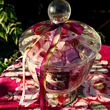 Your new treasures arrive indulgently packaged in bejeweled dupioni silk and velvet pouches, and one with hand-beaded semi-precious stones by Laurie. At the end of our adventure, Laurie presents you with a 3 antique style mirrored boudoir cases filled with your Velvet & Sweet Pea perfumes. Also included are other Purrfumery delights such as luxurious sandalwood and rose bath salts, rare crème perfumes blended from Persian Rose and antique sandalwood and jasmine, Laurie’s famous Face & Body Frosting in your bespoke scent, and jasmine and orange blossom scented dark chocolate truffles.
