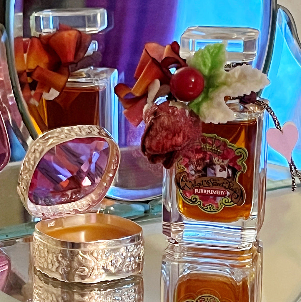 Your new treasures arrive indulgently packaged in embellished vintage velvet flowered crystal flacons, including a dupioni silk pouch – it’s a sensual and opulent treat blended just for you!