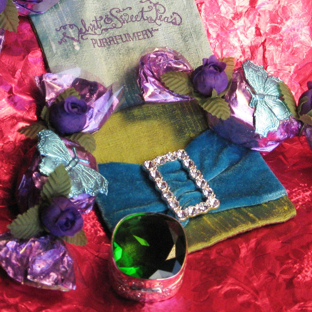 Liquid extrait de parfum is packaged in a Verrieres Brosse crystal bottle and wrapped like whimsical, exquisite candy. The solid perfume is packaged in a custom-designed, limited edition sterling silver jewel box and placed in a silk and velvet pouch with a rhinestone buckle. The finishing touch is a Victorian scent card that captures the spirit of a time when even the advertisements were little works of art.