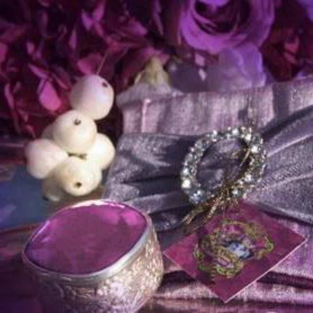 The crème perfume arrives in a custom-designed tourmaline-pink jewel box, tucked into a bejeweled dupioni silk and velvet pouch with its own Victorian scent card. These boxes are custom-designed with very limited availability. They can be re-filled or re-used once the luscious contents are finished. All solid perfumes are made with organic jojoba oil and beeswax from the Purrfumery’s own beehives.