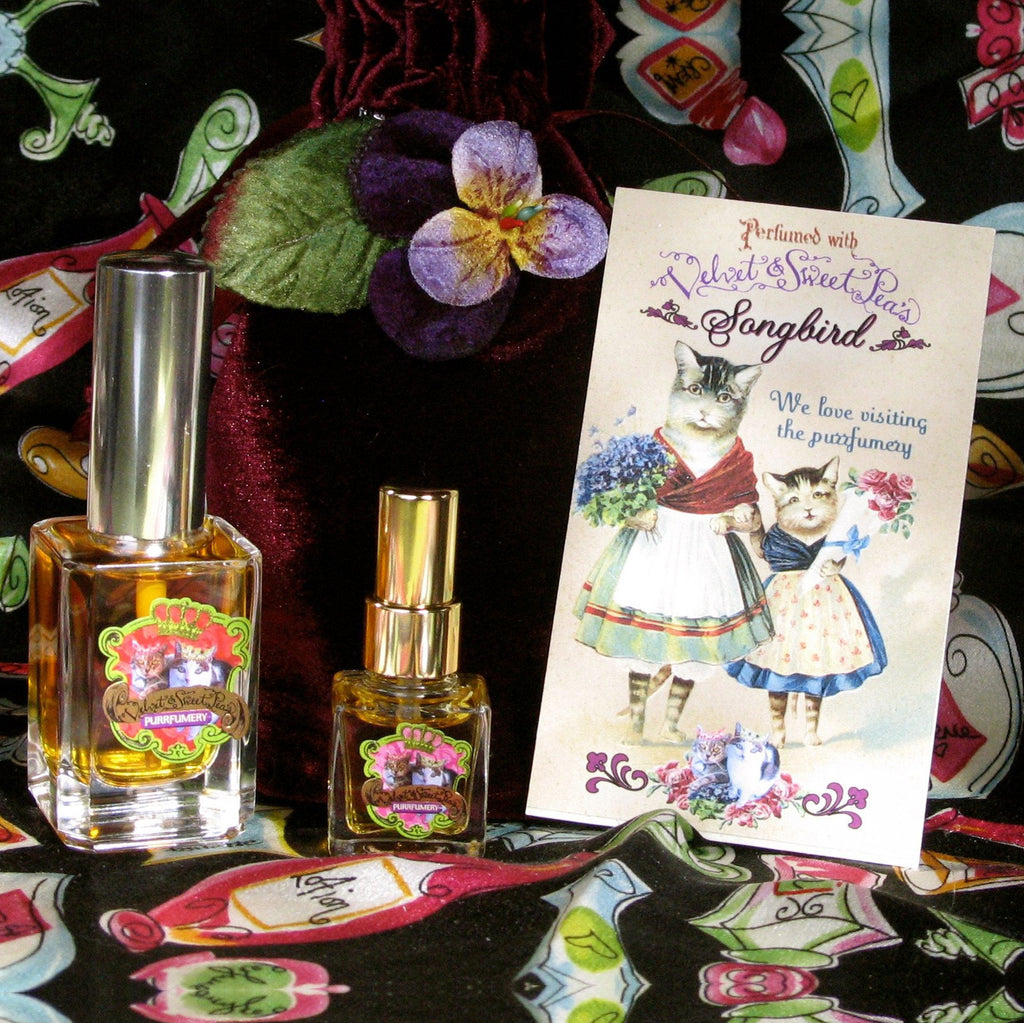 About 17 years ago I was making a custom perfume for a friend and I had her smelling scent strips of my many aromatic treasures. I had a pile of the ones she loved and another pile of the ones she didn’t love. After  making my notes on the ones she loved , I picked up the pile that were not her favorites and sniffed them just as an afterthought.  I loved it! Instead of working on her custom perfume, I was much more compelled to start playing with the rejected pile. I worked on it for a few months and was delighted to come up with Songbird! It was spring and the songbirds were singing wildly outside the Purrfumery window and I was listening to a lot of Emmylou Harris and Lucinda Williams on my CD player. It has rare boronia, antique Ceylon cinnamon, nutmeg, orange blossom, frankincense, sandalwood and many other essential oils and absolutes. I actually presented her this perfume and she went crazy over it! She’s gone through several ounces of it by now and we laugh about it. I still haven’t made her other perfume!