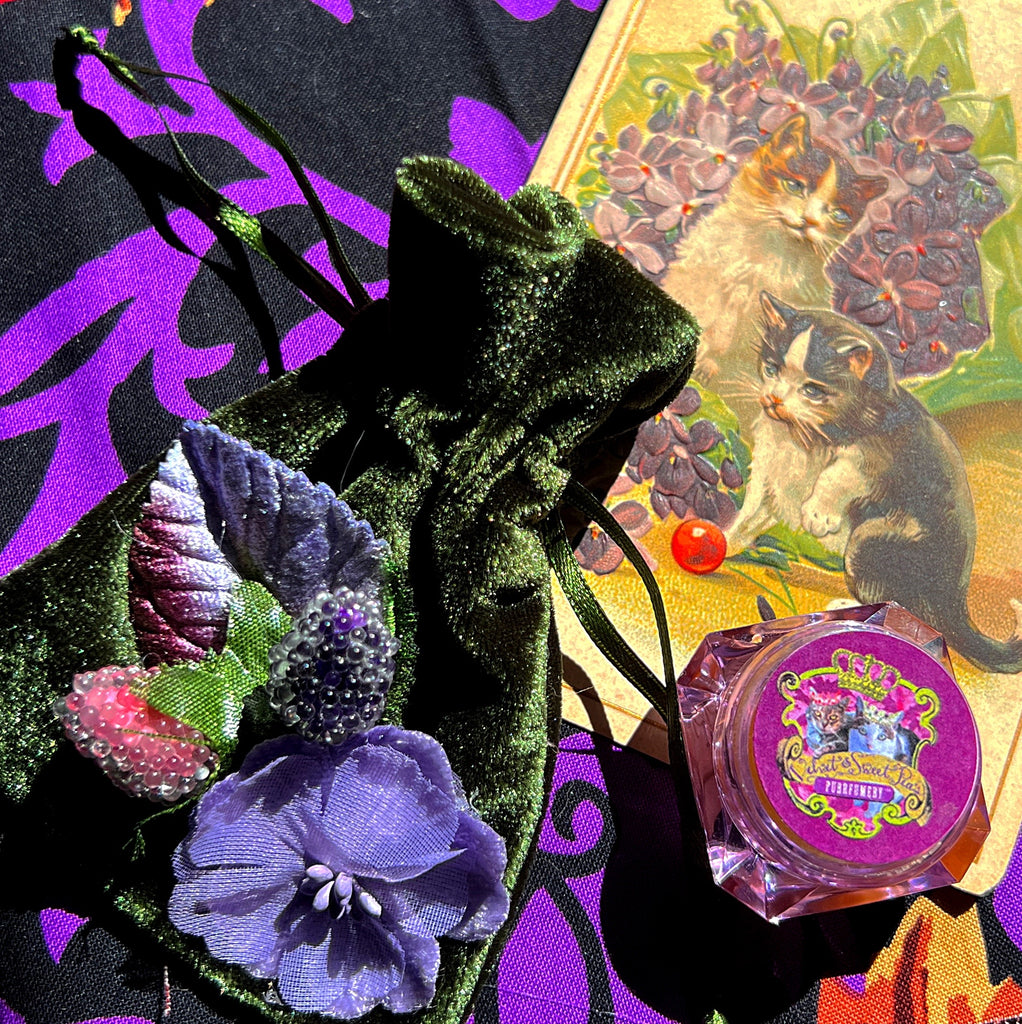 Available as 5ml, 8ml, or 15ml organic jojoba oil based perfume and as an exquisite, creamy solid. The liquid perfumes come in gorgeous round bottles crafted by Verreries Brosse, a Normandy company that has been making bottles for royalty since the 1850s. All come in a vintage flower adorned velvet pouch.